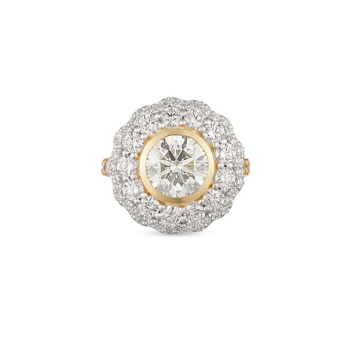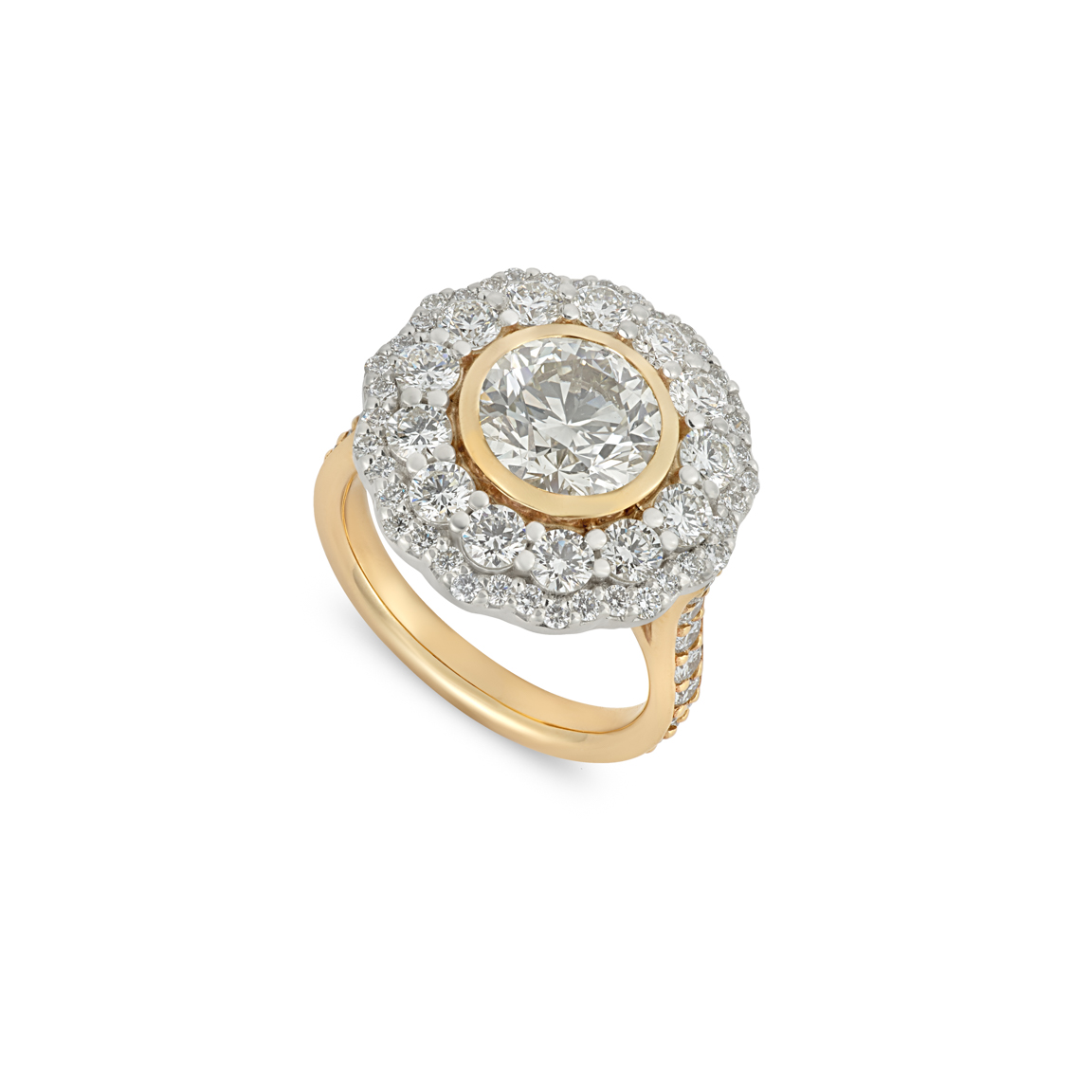 Our Claudia ring set with an 8mm round brilliant-cut champagne diamond, bezel-set in yellow gold and surrounded with 2 halos of round brilliant cut diamonds.