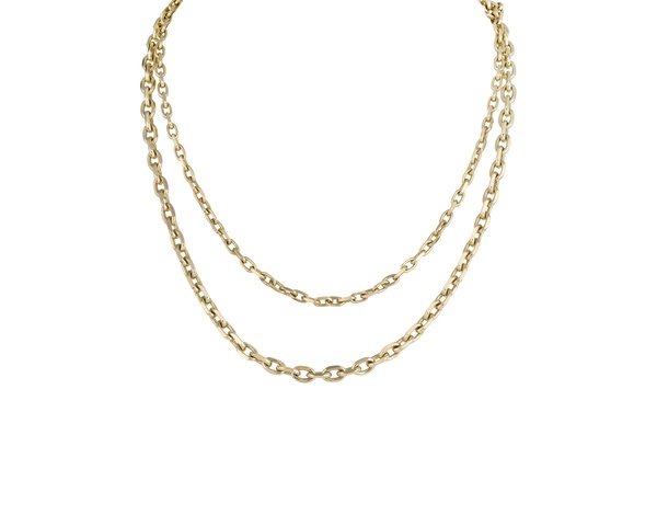 Our solid 9ct yellow gold Helmingham style chain is available in different lengths and 2 different weights. Available with a standard bolt-ring or one of our doughnut clasps.