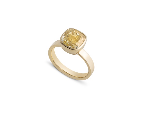 A solid 18ct yellow gold solitaire ring with a bezel set 3.04ct, pale yellow square cushion lab diamond.